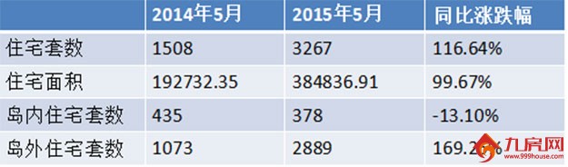 2015年5月厦门全市新建商品房成交5693套,其中一手住宅成交3267套,比去年同期的1508套增加了1759套,同比上涨116.64%;比2015年4月的1949套增加了1318套,环比上涨67.62%。一手住宅签约面积384836.91平方米,与2015年4月的135587.08平方米相比,环比上涨183.83%。