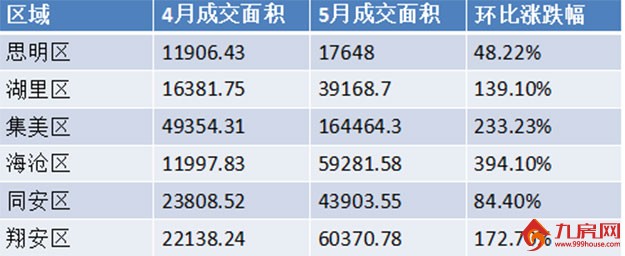 思明区 5月一手住宅成交127套,成交面积17648㎡,比4月多了27套,套数环比上涨27.00%,成交面积环比上涨48.22%。