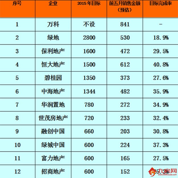 2015年前5月典型房企全年销售目标完成情况 (亿元)