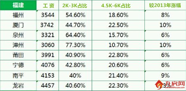 从统计表格可以看出,全省各市2K-3K的工资占比最大,其中漳州平均工资最低,2K-3K占比最大,高达77.3%。而龙岩平均工资最高,相比2013年涨幅也最大,高达23%,其次涨幅较大为厦门、漳州。