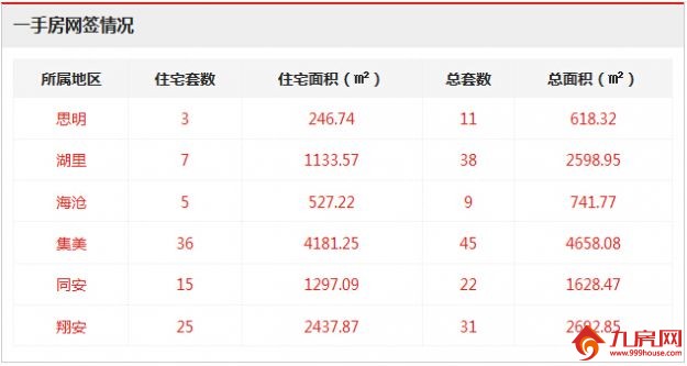 2015年6月9日,厦门全市商品房总共成交155套,一手住宅成交90套,环比上涨5.88%。思明区3套,湖里区7套,海沧区5套,集美区36套,同安区15套,翔安区24套。