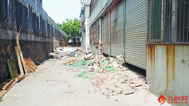 记者在现场看到,该楼一楼北侧的通道堆满了敲打下来的砖块等土头垃圾,一楼外墙墙面有明显的敲打施工痕迹,且已安装了3道卷帘门。北侧一楼里面空间,也在施工。