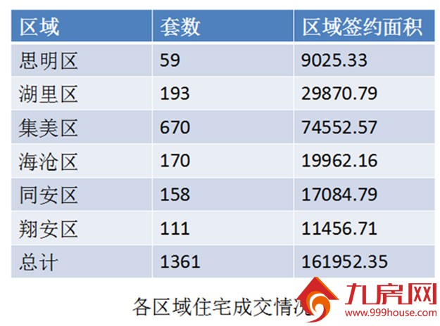 在各区一手住宅成交方面,集美区以670套的成交量居全市各区一手住宅成交量之首;湖里区成交193套,位居第二;海沧区成交170套,排名第三。