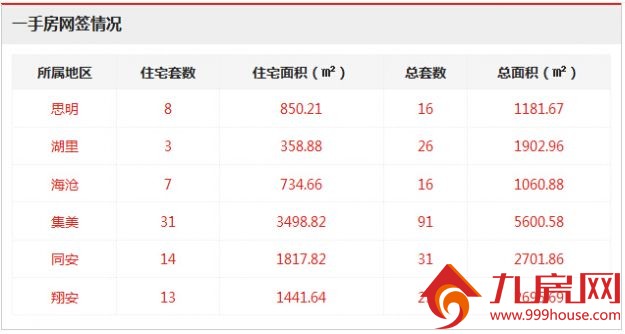 2015年6月23日,厦门全市商品房总共成交203套,一手住宅成交76套,环比下跌162.07%。思明区8套,湖里区3套,海沧区7套,集美区31套,同安区14套,翔安区13套。