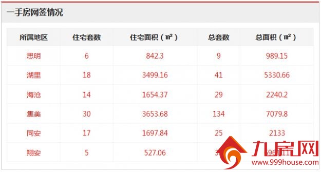 从各区的一手住宅成交数据来看,集美区成交30套,位居全市一手住宅成交排行榜榜首;湖里区成交18套,位居排行榜第二位;同安区成交17套,位居排行榜第三位。