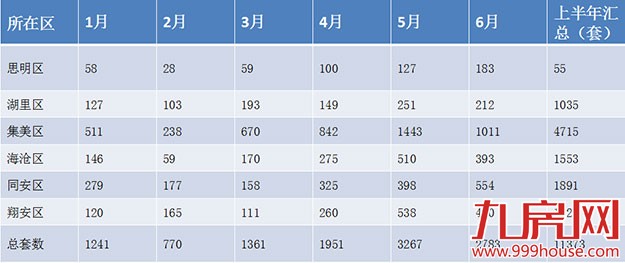 据厦门市国土资源与房产管理局数据显示,2015年上半年,厦门全市住宅共成交11373套,与2014年下半年的11741套相比,环比下跌3.13%;与2014年上半年相比,同比下降20.73%。月均成交约1895套,日均成交约61套。2015年上半年住宅成交面积为1334244.95平米。其中,集美区住宅面积成交量占全市总成交的39.92%,位居全市第一。