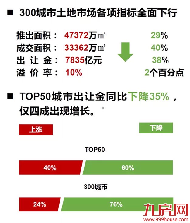 数据统计显示,300城市土地市场各项指标(推出面积,成交面积,出让金,溢价率)全面下行,城市出让金同比下降35%,大约4成的城市出让金为增长态势。政策方面,对于一二线城市政府严格控制土地出让规模,相反,对于与三四线城市,企业的动力不足。