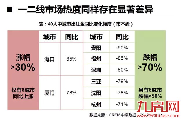 在一二线土地市场中同样出现明显差异。厦门、海口等8座城市土地出让金为涨幅且大于30%,相反贵阳,福州,深圳,杭州,沈阳,三亚土地出让金为跌幅情况。