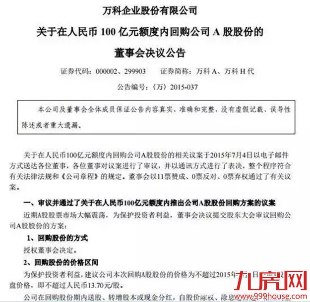 近日,万科A发布公告称,董事会于两日前以全票通过在人民币100亿元额度内回购公司A股股份的相关议案。万科董事会方面认为近期A股股票市场大幅震荡,回购股份有利于保护投资者。目前,该董事会决议将提交股东大会审议。