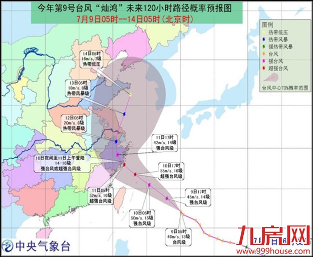 台风“灿鸿”的中心今天早晨5点钟位于我国钓鱼岛东偏南方大约760公里的西北太平洋洋面上,中心附近最大风力有13级。预计,“灿鸿”将以每小时20公里左右的速度向西偏北方向移动,强度继续加强,将于10日白天进入东海东南部海面,最强可达超强台风级,然后逐渐向浙闽一带沿海靠近,并有可能于10日夜间至11日上午登陆上述沿海地区,登陆强度可达强台风级或超强台风级。