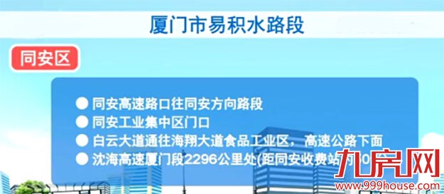 另外,还有同安区的同安高速路口往同安方向路段、同安工业集中区门口、沈海高速厦门段2296公里处以及翔安区的白云大道海翔大道路口,都比较容易积水。