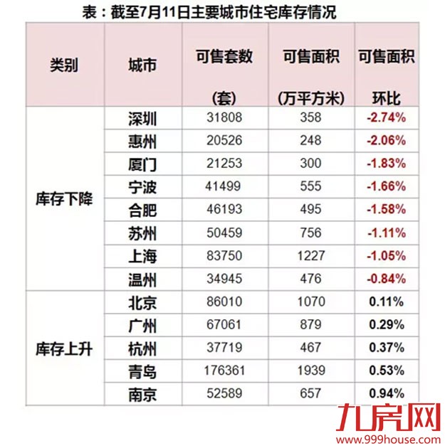 截至2015年7月11日,CREIS中指数据监测的13个主要代表城市库存总量环比上周下降0.44%。库存下降的城市中,深圳、惠州库存降幅均超过2%,而库存上涨的5个城市中其涨幅均在1%以下。对于厦门库存量而言,可售面积环比下降1.83%,可售套数为21253套,可售面积300万平方米。