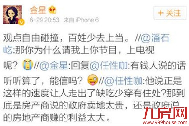 金星在节目里鼓励年轻人别买房子,拿父母的钱那不叫买房子。在西方只有20%的人买房子,其他人都租房。并表示自己就是租房子,名下并没有房产。而对此,潘石屹作为房产大亨,语出惊人:我也劝年轻人别买房子!