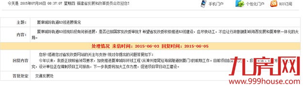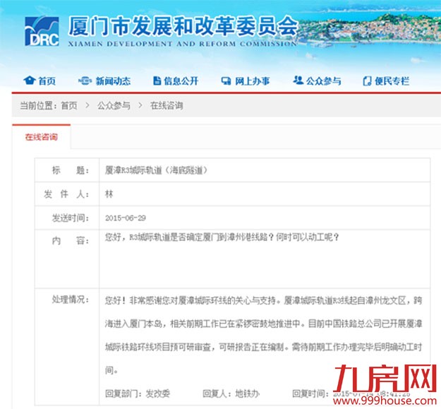 有网友向厦门市发改委就厦漳城际轨道R3线的建设进度进行咨询。对此,市发改委回复表示,我市积极配合省里开展厦漳城际轨道R3线各项前期工作,目前各项工作正稳步推进。中国铁路总公司和福建省政府已组织开展厦漳城际轨道R3线预可研审查,近期将完成预可研批复。R3线可研报告正抓紧编制并计划于本月内完成初稿。
