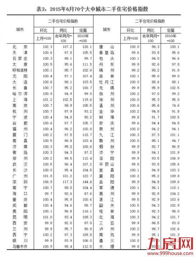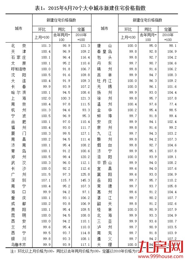 从同比数据来看,与去年6月相比,70个大中城市中,价格下降的城市有68个,上涨的城市有2个。6月份,同比价格变动中,最高涨幅为15.9%,最低为下降9.8%。