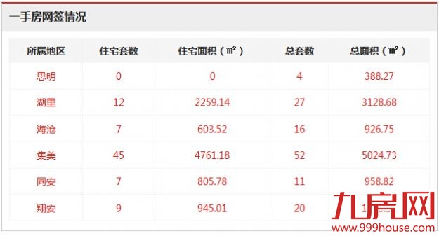 从各区的一手住宅成交数据来看,集美成交45套,位居全市一手住宅成交排行榜榜首;湖里区成交12套,位居排行榜第二位;翔安区成交9套,位居排行榜第三位。