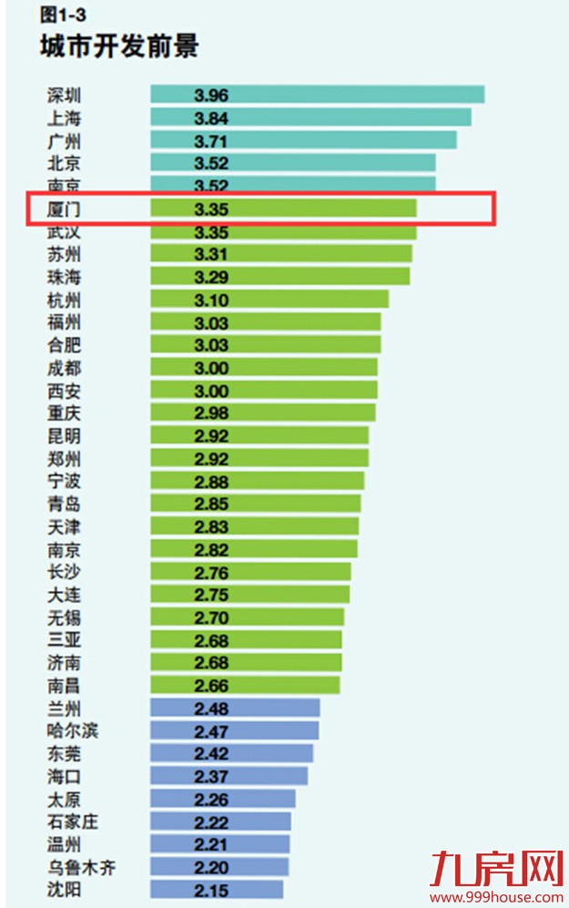 此外,在开发前景方面,四强城市的排名有所变化:2015年,深圳取代上海跻身第一位,成为上海连续两年称霸榜首的终结者;北京则超过南京,排名第四。榜单排名前五的城市分别为:深圳、上海、广州、北京、南京。而厦门同样处于全国第6的位置,分数值为3.35。