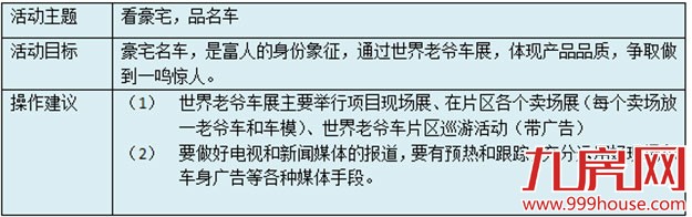 名车试驾,与媒体、汽车销售商联和运作,开发商提供赞助和场所,媒体负责宣传推广。