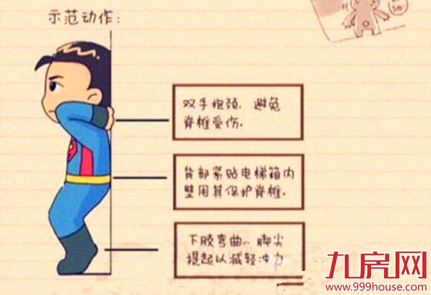 膝盖呈弯曲姿势,借用膝盖弯曲来承受重击压力;把脚跟提起,就是踮脚,电梯中人少的话最好要把两臂展开握住扶手或贴电梯壁;整个背部和头部紧贴电梯内墙,呈一直线,运用电梯墙壁作为脊椎的防护。