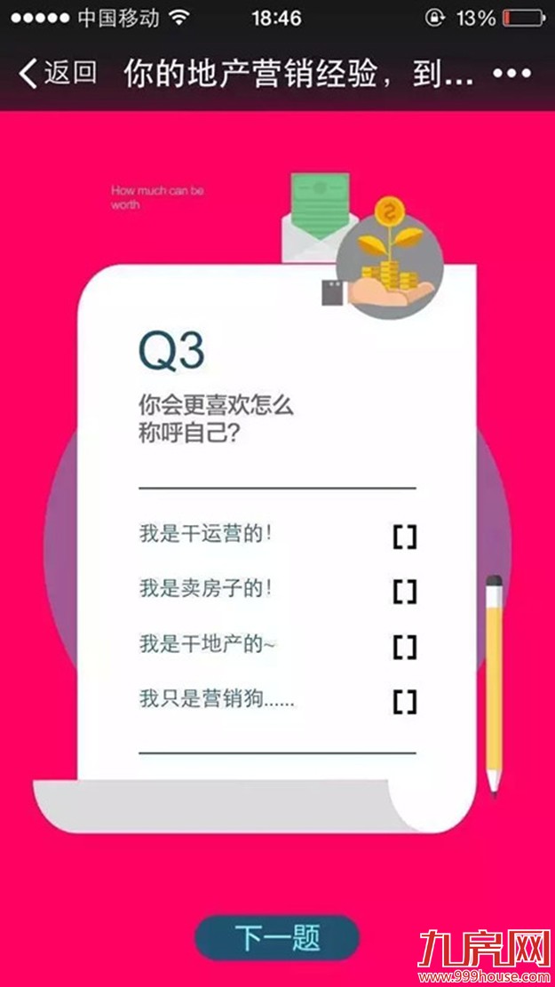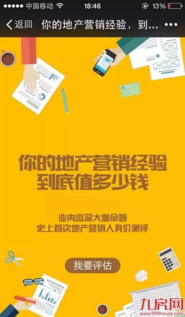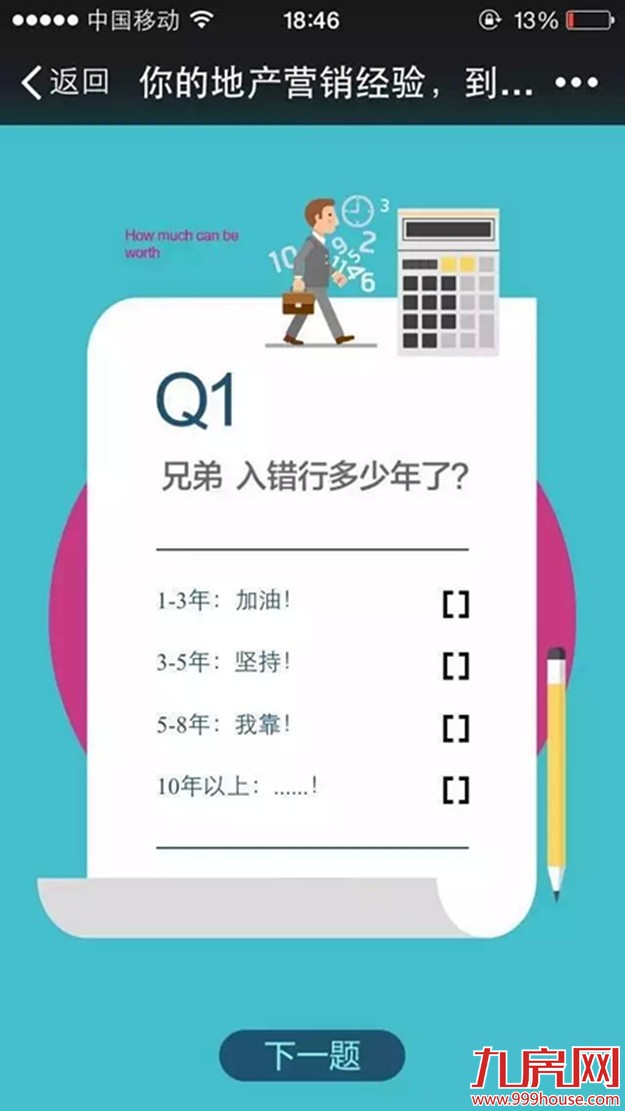 今天朋友圈被一则测试刷屏了,从包括心理年龄、内心独白和星座属相等各种你意向不到的角度对你的地产营销经验进行测试,让你知道你的真实身价值多少钱。测试上线不到1小时,各相关人士纷纷加入测试,当中更引发了众多名人大咖、路人甲乙的疯狂刷屏。