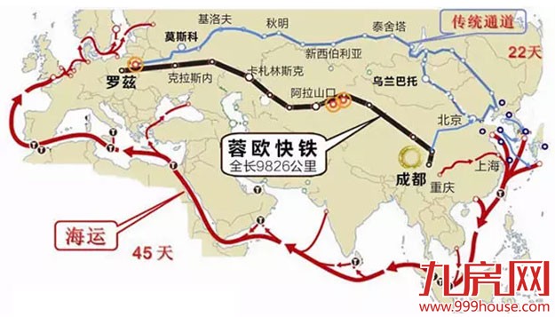 (蓉欧铁路与传统亚欧运输方式比较示意图)
