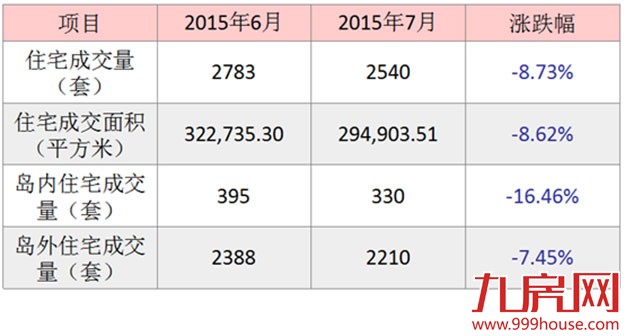 根据官方数据统计,2015年7月厦门全市新建商品房成交4606套,其中一手住宅成交2540套,比去年同期的1711套增加了829套,同比上涨48.45%;比2015年6月的2783套减少了243套,环比下跌8.73%。一手住宅签约面积294903.51平方米,与2015年5月的322735.30平方米相比,环比下跌8.62%。