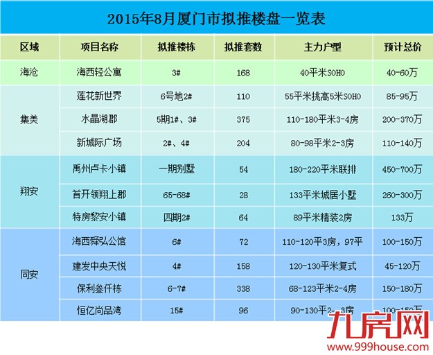 由于上半年尤其是刚需盘消化了不少需求,新需求还需要一定时间的积累,导致房企的推盘节奏骤然放缓,8月也将延续这一态势,预计有11个楼盘入市,共计推盘1661套,住宅推量约为1383套。集美和同安占据绝对优势,两区共推出1353套,客群覆盖投资、刚需、首改三类。其中集美预计推出3盘689套,同安预计推出4盘664套。