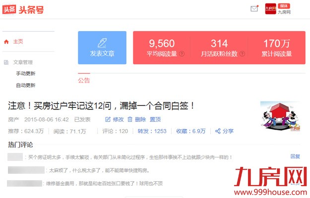 自7月1日,九房网正式加入《今日头条》以来,屡屡创阅读量新高,短短一个月时间,就达到单条阅读量70w+的佳绩!平均阅读量过万,累计阅读量144w!