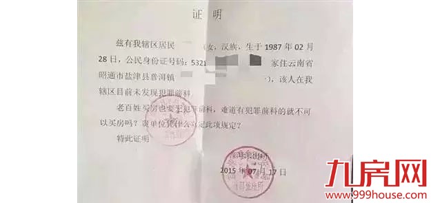 昨日,云南昭通市盐津县普洱派出所出具的一张证明中,质问“难道有犯罪前科就不能买房”引发网友围观。证明中,云南昭通市盐津县普洱派出所民警在为居民证明无犯罪前科之后,作出上述质问。