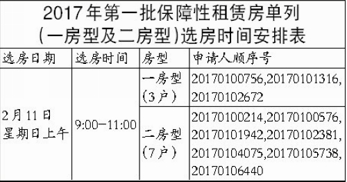 经2017年7月4日公示无异议并已确认保障性租赁房单列一房型及二房型分配资格的10户申请家庭符合选房条件,具体选房时间安排如下: