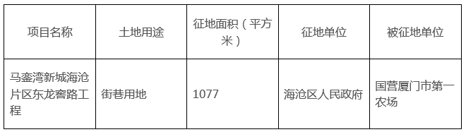 本网获悉,厦门市人民政府发布土地征收及收回国有用地的通告,决定征收海沧区东孚街道东瑶村委会集体土地20755平方米、芸美村委会集体土地12049平方米,收回国营厦门市第一农场国有农用地1077平方米,合计33881平方米作为马銮湾新城海沧片区龙窖路工程项目建设用地。具体如下: