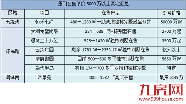 目前厦门在售总价超5千万以上的豪宅共有7个,分别是:恒禾七尚、大洲龙墅尚品、璟湾二十八玺、云顶庄园、皇府御园、当代半岛、帝景苑。而这7个项目中6个在售主力产品为岛内高端别墅,仅帝景苑一家主推岛内超高层产品。