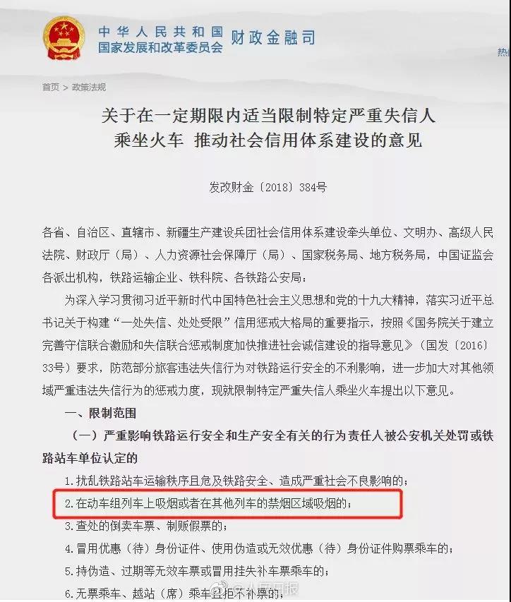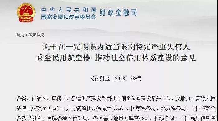 近日,国家发改委、民航局、铁路总公司等部门联合发布多个相关意见,在一定期限内适当限制特定严重失信人乘坐火车、民用航空器。意见自2018年5月1日起实施。