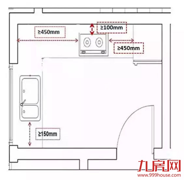 厨房洗涤池距两侧墙体应≥150mm,灶具边缘距离墙面净距应大于100mm。为保证灶具正上方的油烟机排油烟效果,灶具距离左右两侧墙面宜大于450mm,防止油烟机紧靠墙角安装导致角落里负压区的油烟不流动无法排走。