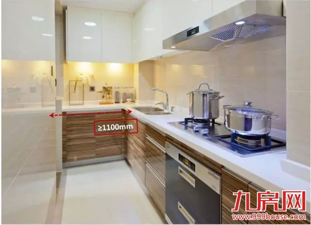 单排布置设备的厨房过道净宽≥1100mm,同时不得小于900mm,可供一人做饭的同时,另一人侧身通过,两侧墙体间轴线尺寸≥2100mm