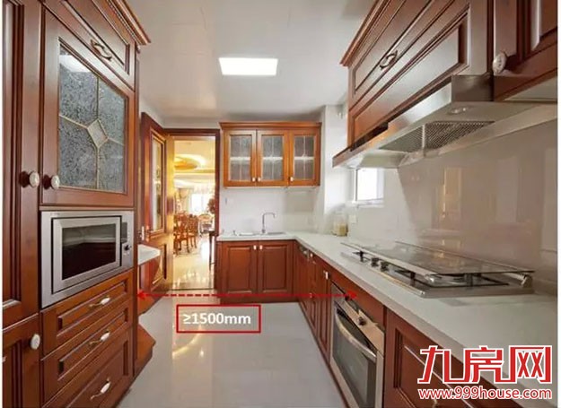 双排布置设备的厨房其两排设备的过道净距≥1500mm,两侧墙体间轴线尺寸≥3000mm
