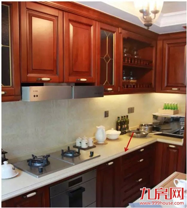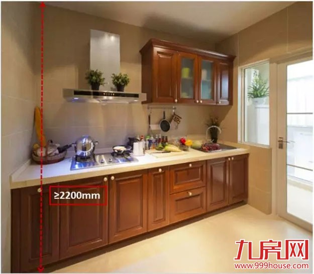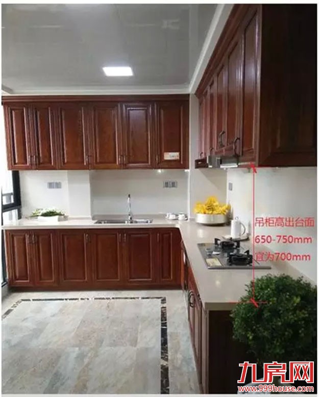 依据中国人的习惯,台面一般高出地面800mm左右,吊柜高出台面应在650-750mm,最方便中国人的身高取放吊柜内物品。安装欧式油烟机时,油烟机底面与吊柜底面平齐较为美观,油烟机在高出台面700mm时效果最好,所以吊柜高出台面700mm最适宜。