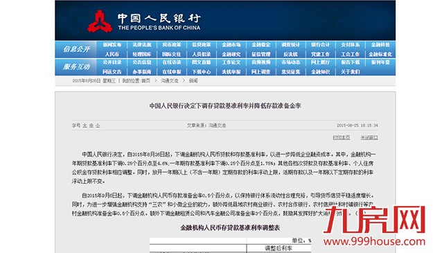中国人民银行决定,自2015年8月26日起,下调金融机构人民币贷款和存款基准利率,以进一步降低企业融资成本。其中,金融机构一年期贷款基准利率下调0.25个百分点至4.6%;一年期存款基准利率下调0.25个百分点至1.75%;其他各档次贷款及存款基准利率、个人住房公积金存贷款利率相应调整。同时,放开一年期以上(不含一年期)定期存款的利率浮动上限,活期存款以及一年期以下定期存款的利率浮动上限不变。