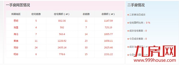 2015年9月7日,厦门全市二手房无成交数据,二手房成交住宅套数无成交数据,一手住宅成交57套,环比下跌6.56%。其中,思明区5套,湖里区4套,海沧区7套,集美区11套,同安区24套,翔安区6套。