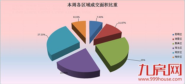 从各区成交情况看,同安区一手住宅成交134套,环比下跌53.63%,再次位居一手住宅成交排行榜首位;集美区成交113套,环比下跌32.74%,位居一手住宅成交排行榜第二位;海沧区一手住宅成交101套,环比上涨1%,位居一手住宅成交排行榜第三位。