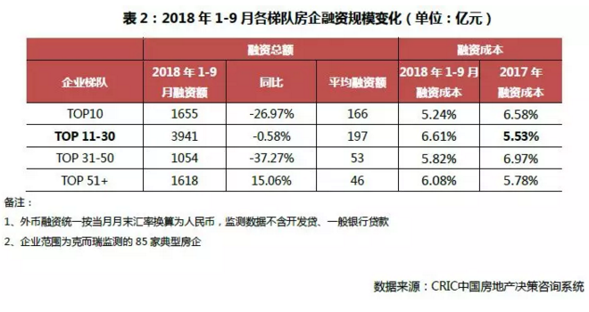 企业表现:9月,融资总量最高的企业为中海地产,融资总量103.3亿元,为一笔两种品种混合的境外高级债券,也是本月企业融资的单笔融资额最高的企业,此外,碧桂园在9月19日发行5.5亿美元的境外优先票据,单笔融资额也较高。2018年1-9月,TOP10房企融资同比减少26.97%,若是剔除中国恒大的影响,其余TOP10房企的融资规模同比增长14.4%,前十房企在融资收紧的情况下还是有充足的融资实力。