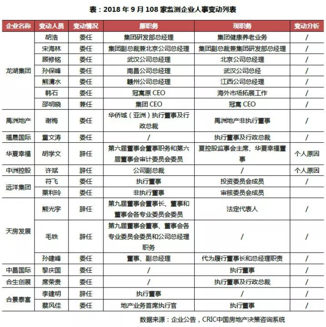 从108家监测企业的人事变动情况来看,9月房企高管变动频率和8月相比持平,动态从前几月的离职为主,转向以新任职及委任为主,总体的变动同比浮动较小。