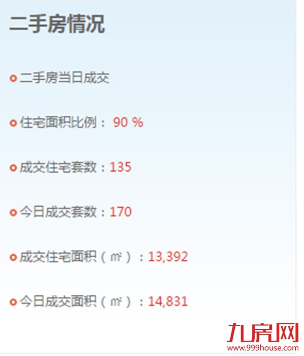 2015年9月30日,全市二手房成交套数为135套,二手房成交住宅套数成交170套,一手住宅成交185套,环比上涨37.04%。思明区1套,湖里区8套,海沧区51套,集美区79套,同安区28套,翔安18套。