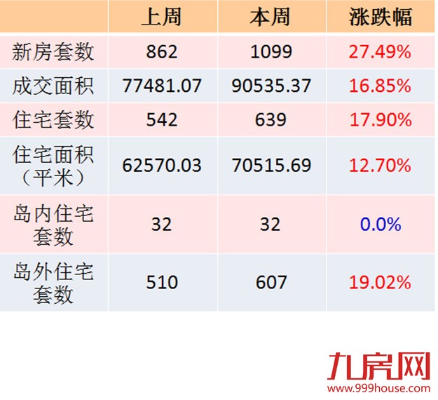 本周(10月5日—10月11日)厦门全市商品房成交1099套,环比上涨27.49%。岛内一手住宅成交32套,环比与上周持平,签约面积5388.22平米,占全市一手住宅总成交面积7.64%;岛外一手住宅成交607套,环比上涨19.02%,签约面积65127.47平米,占全市一手住宅总成交面积92.36%。