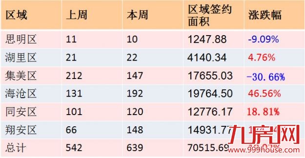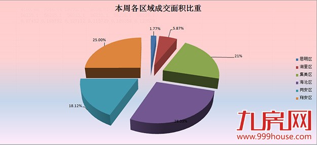 从各区成交情况看,海沧区一手住宅成交192套,环比上涨46.56%,位居一手住宅成交排行榜首位;翔安区成交148套,环比上涨124.24%,居一手住宅成交排行榜第二位;集美区一手住宅成交147套,环比下跌30.66%,位居一手住宅成交排行榜第三位。