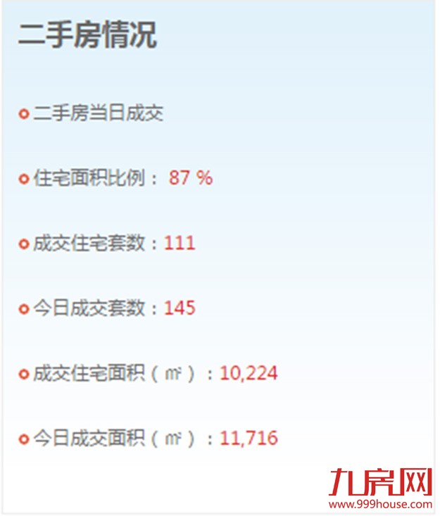 2015年10月14日,全市二手房成交套数为145套,二手房成交住宅套数成交111套,一手住宅成交66套。思明区3套,湖里区4套,海沧区9套,集美区22套,同安区17套,翔安11套。