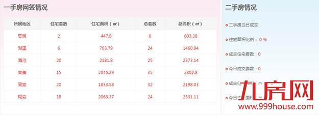 2015年10月24日,全市二手房成交套数为0套,二手房成交住宅套数成交0套,一手住宅成交81套。思明区2套,湖里区6套,海沧区20套,集美区15套,同安区20套,翔安18套。