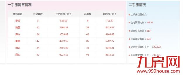2015年10月30日,全市二手房成交套数为274套,二手房成交住宅套数成交213套,一手住宅成交165套。思明区3套,湖里区20套,海沧区24套,集美区42套,同安区24套,翔安52套。