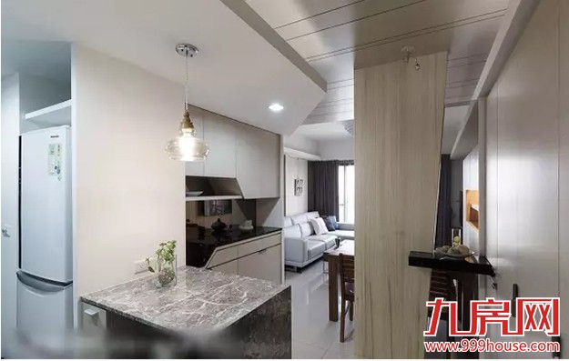 ★★设计师将完整的厨房机能,规划在入门处的左手边,运用冰箱与矮柜的摆放位置,隐蔽厨房内凌乱的视觉感。冰箱后方的电器柜,则以高低差设计手法满足各式尺寸电器的摆放需求。