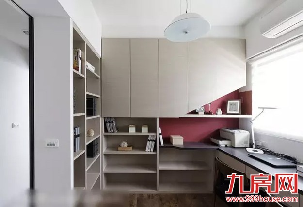 ★★同样具有完善收纳机能的书房空间,墙面跳以活泼的红色,赋予空间年轻活力。
